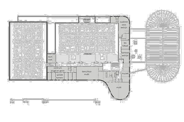 Multifunctionaliteit is steeds een belangrijk criterium geweest in het navolgende proces. Zo is er een multifunctionele topsporthal ontstaan met tribune, die door materiaal- en kleurtoepassing, scheidingswanden en gordijnen, ook geschikt is voor theater en andersoortige grote evenementen. De bibliotheek is vormgegeven als transitoruimte naar andere functies zodat extra gangen niet hoeven te worden gemaakt. De centrale ontmoetingsruimte is als verbindende plus (+) ontworpen met een restaurant en café. Er is een groot aanbod gecreëerd aan soorten van ruimten met verschillende hoogtes en diverse vormen.