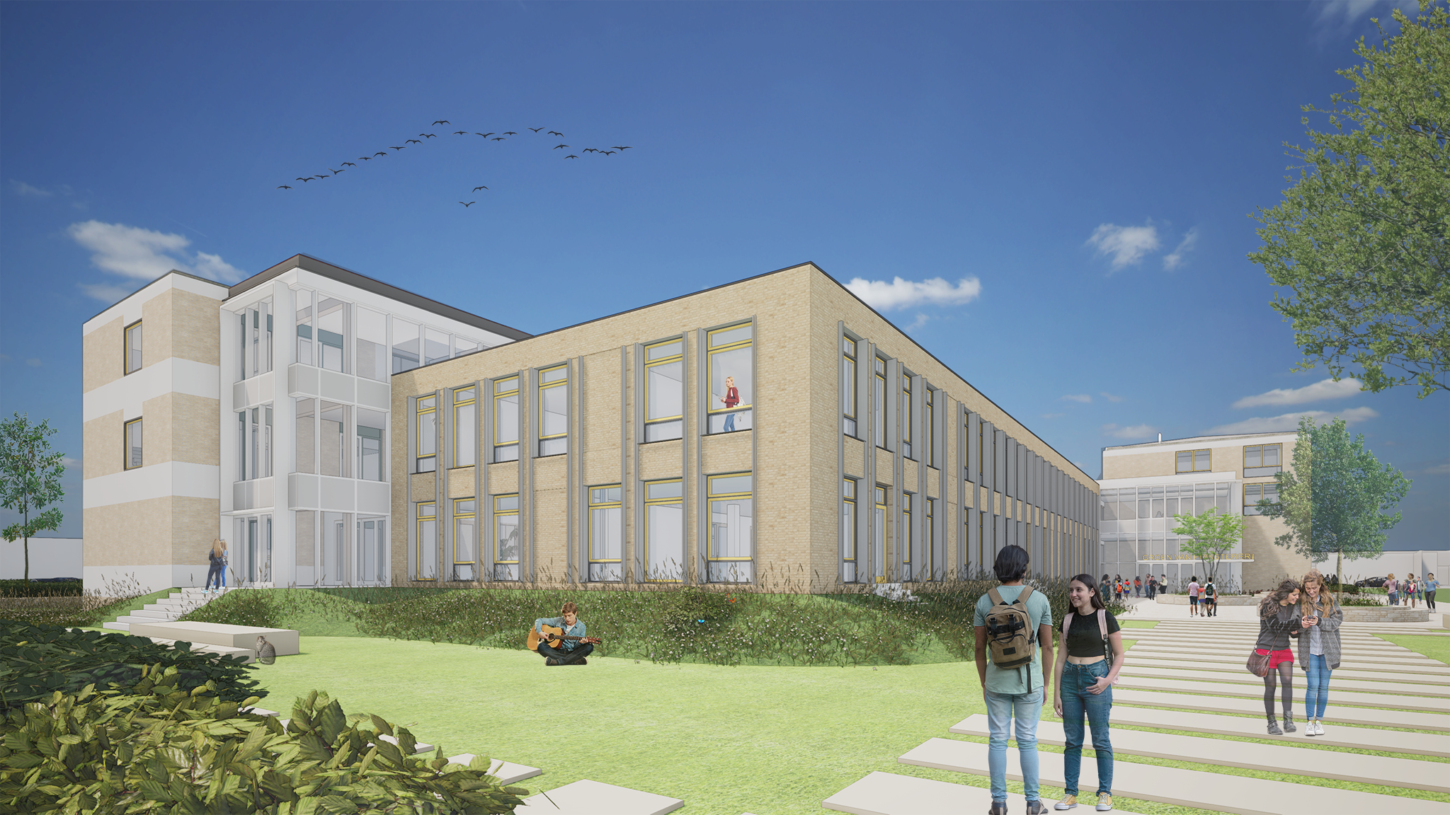 Binnen het monument zelf zijn aanpassingen gedaan met respect voor de bestaande structuur. De gangen zijn deels bij de lokalen betrokken om meer ruimte te bieden, maar de oorspronkelijke zichtlijnen zijn bewaard gebleven door verlaagde zones en doorzichten. Karakteristieke details, zoals de entreehal met de beelden van Hank Hans, het originele zaagtandplafond van de aula en de bijzondere trappenhuizen, zijn zorgvuldig behouden en geïntegreerd in het nieuwe gebruik. Het resultaat is een onderwijscomplex waarin verleden en toekomst elkaar versterken. Het rijksmonument behoudt zijn cultuurhistorische waarde en herkenbaarheid, terwijl de nieuwbouw voorziet in de ruimtelijke en functionele eisen van modern onderwijs. Door subtiele contrasten in architectuur, materialisering en detaillering ontstaat een hedendaagse toevoeging die niet in concurrentie treedt met het monument, maar het juist versterkt.
